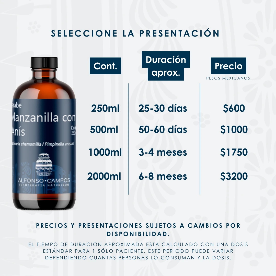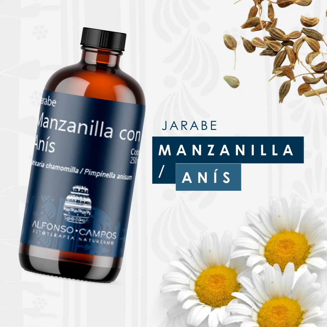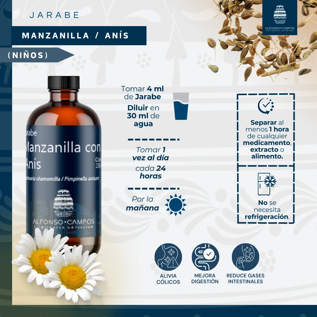 El jarabe de Manzanilla (Matricaria chamomilla) y Anís (Pimpinella anisum) es una fórmula tradicional orientada al alivio de molestias digestivas asociadas a la acumulación de gases. Ambas plantas son ampliamente reconocidas por sus propiedades carminativas, antiespasmódicas y digestivas, que favorecen la expulsión de gases intestinales y ayudan a disminuir la distensión abdominal. Esta combinación actúa de forma suave pero efectiva para calmar el aparato digestivo, especialmente después de comidas pesadas o difíciles de digerir.