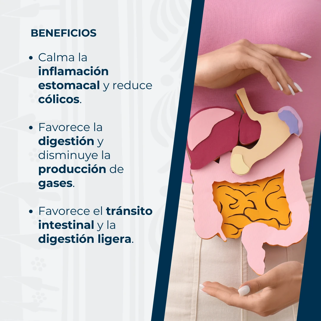 • Acción carminativa: Ayuda a reducir la formación y acumulación de gases intestinales, disminuyendo la sensación de inflamación y presión abdominal.